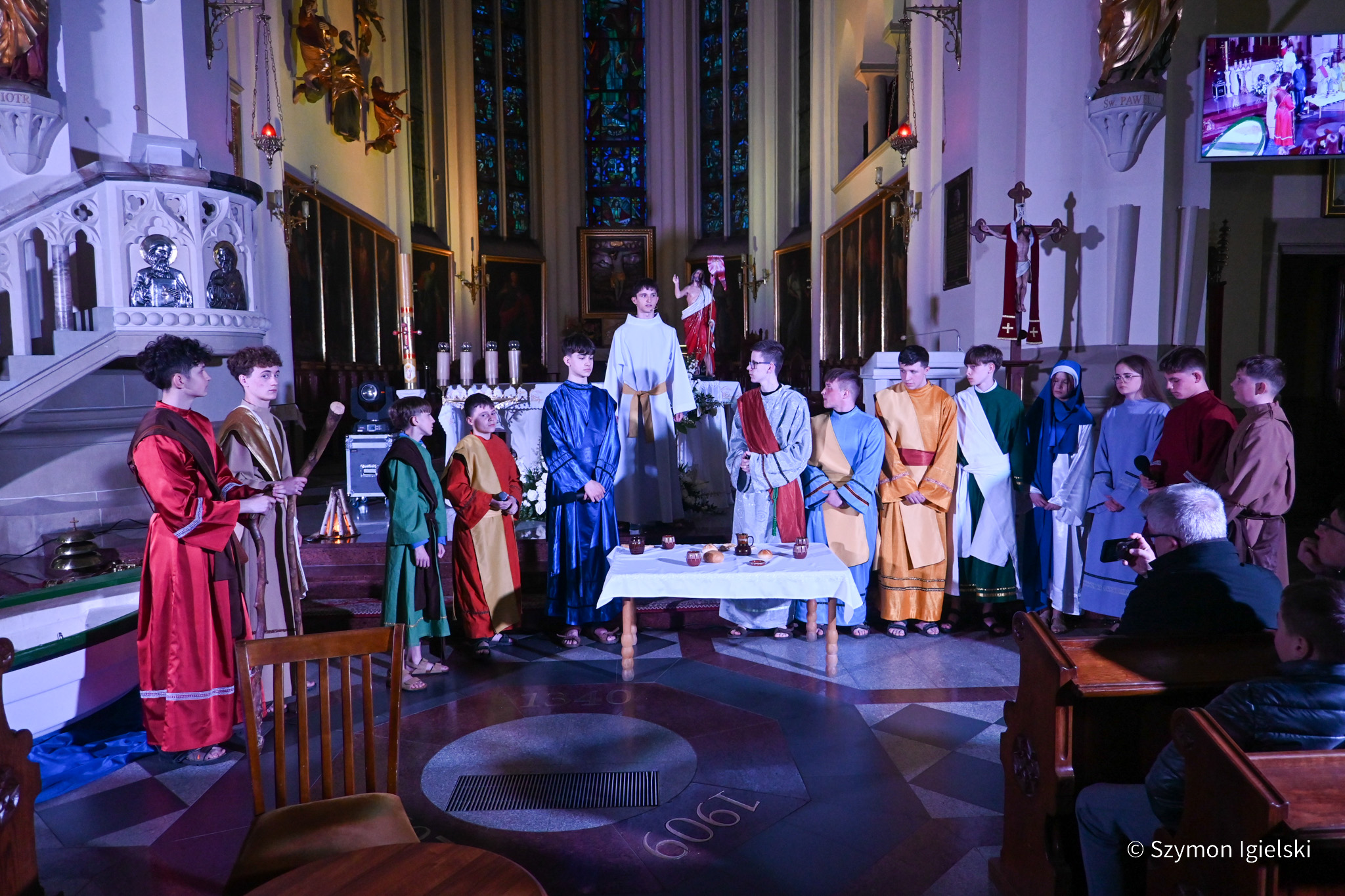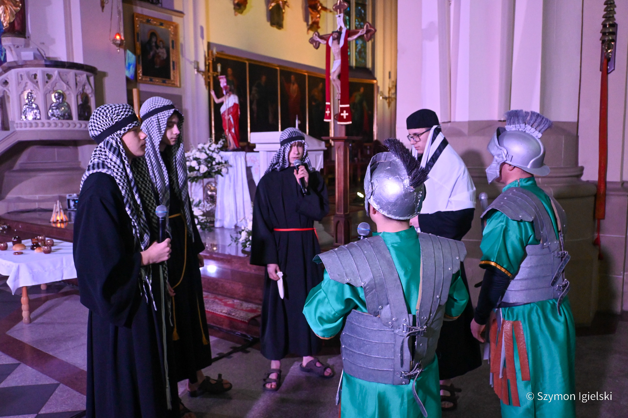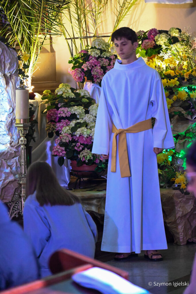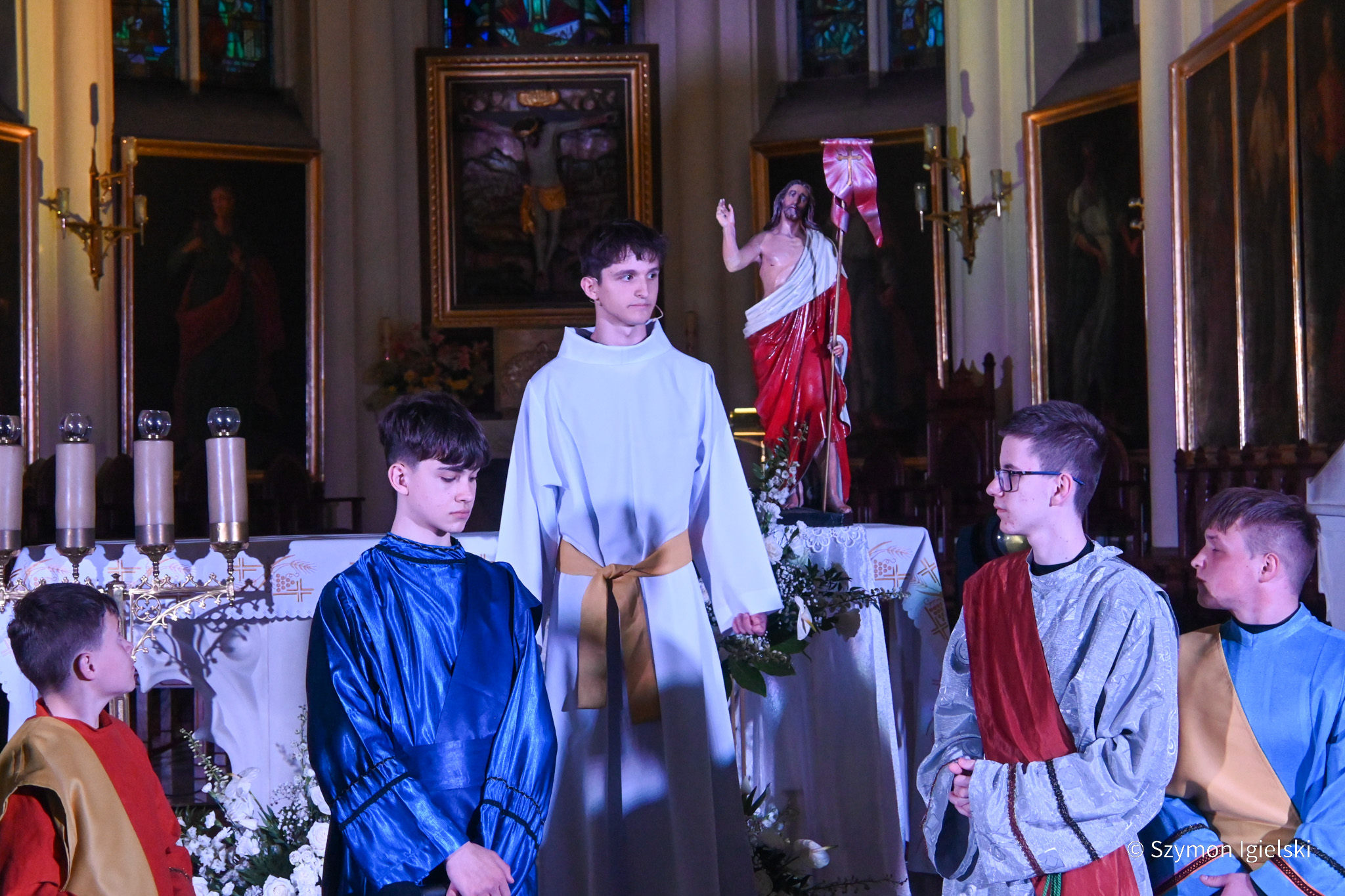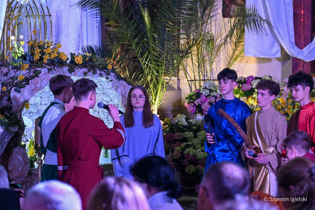 Wieczorem 12 kwietnia w niedzielę Bożego Miłosierdzia w naszej Bazylice w Grybowie odbył się piękny spektakl o Zmartwychwstaniu Pana Jezusa przygotowany przez młodzież z KSM – u i opiekunów. Na zakończenie ks. Proboszcz Prałat Ryszard pogratulował młodzieży talentu i entuzjazmu wiary i zachęcił do dalszego działania. Głos również zabrał ks. wikariusz Wiesław opiekun młodzieży w naszej parafii i koordynator przedstawienia. Młodzież wyraziła ogromną wdzięczność wszystkim przybyłym gościom a szczególnie Paniom koordynatorkom przedstawienia Barbarze Glińskiej i Bogusławie Nowak. Miedzy scenami biblijnymi pieśni śpiewał zespół: Echo Nieba.